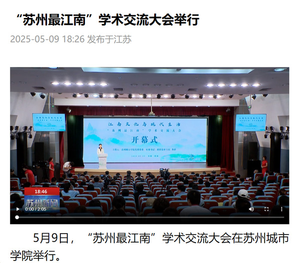 为深入贯彻落实党的二十届三中全会精神,全面推进苏州市“加快建成文化强市”的“811”计划中关于江南文化传承创新的重点行动,5月9日下午,由苏州城市学院主办,苏州江南文化研究中心和文正智库承办的“苏州最江南”学术交流大会在苏州城市学院学术报告厅举行。本次会议以“江南文化与现代生活”为主题,聚焦苏州在江南文化现代转化中的示范作用,解码江南文化基因与当代城市发展的融合机制,探索太湖流域“水韵江南”的文化内核,探讨江南美学的启示,为地方知识生产提供“苏州方案”。